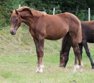 Diese typstarke Stute hat sehr viel Ausstrahlung und tolle bergauf Bewegungen. Ihr erstes Fohlen erhielt die Höchstnoten und bekam die Fohlenprämie.
