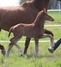 Er ist ein am 28. März 2016 geborener Sohn unseres früheren Hengstes Don Farinelli v. Don Juan de Hus aus der Halbschwester unseres Hengstes Sommertraums, L.A. Lina R von Los Angeles. Auch sie konnte sich bei ihrer SLP 2018 beweisen und ihre Qualität zeigen.
