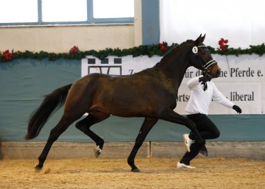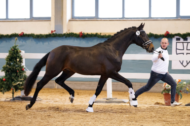 Ein Hengst der sich erstklassig, mit hoher Elastizität bewegen kann. Er überzeugt besonders mit seinem raumgreifenden, taktsicheren Schritt.